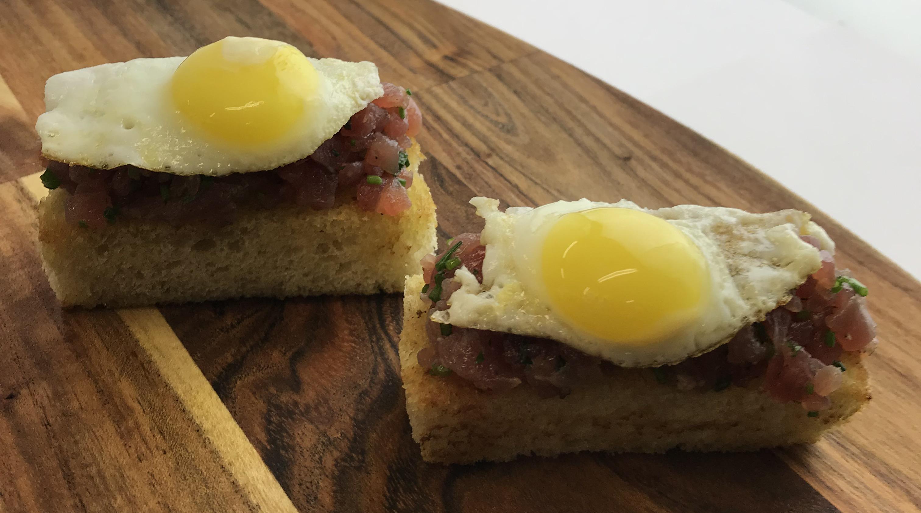 - Sneetje wit brood belegd met gerookte forel, afgewerkt met preischeuten en olijf