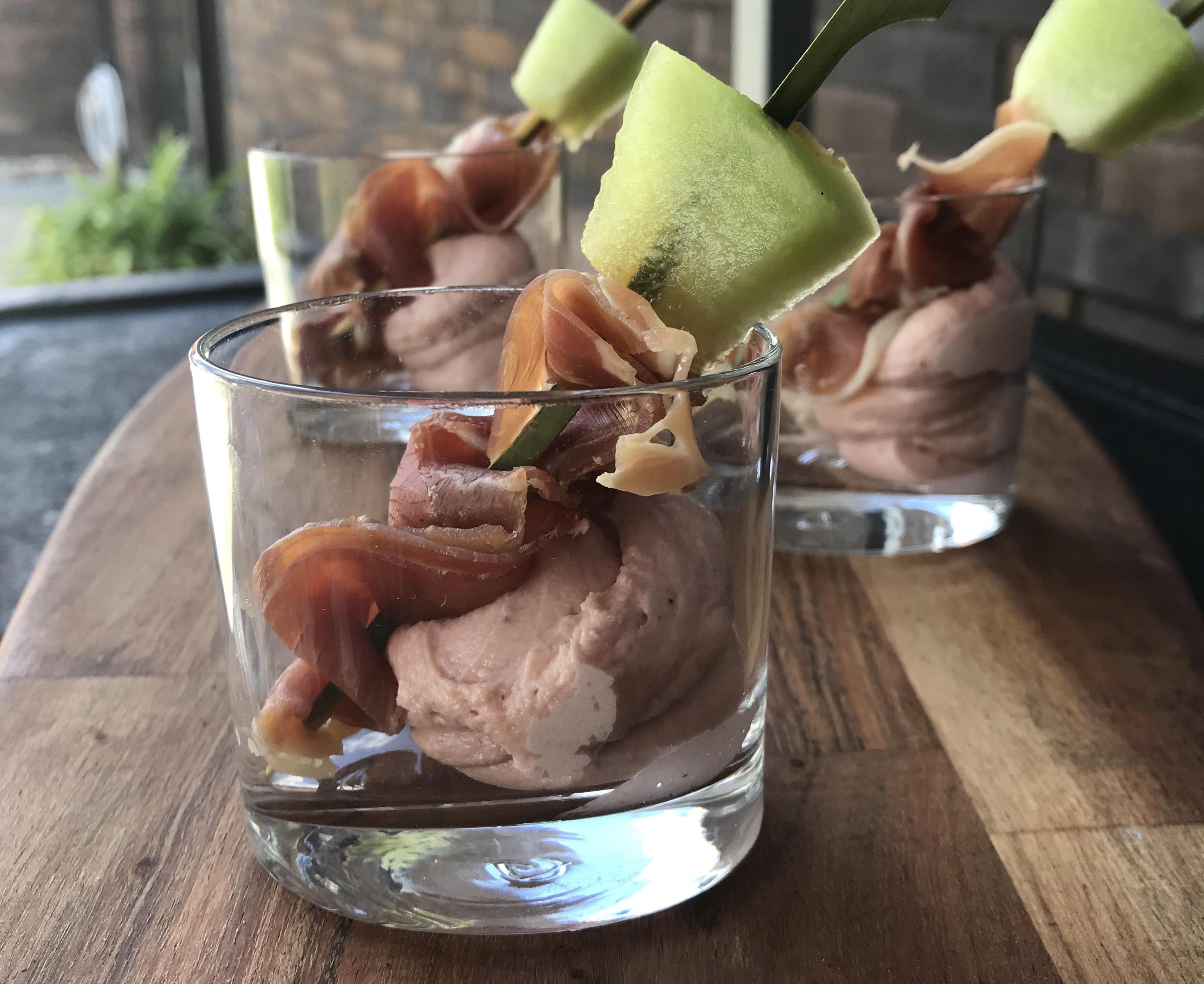 - Glaasje opgevuld met zalmmousse, afgewerkt met preischeuten