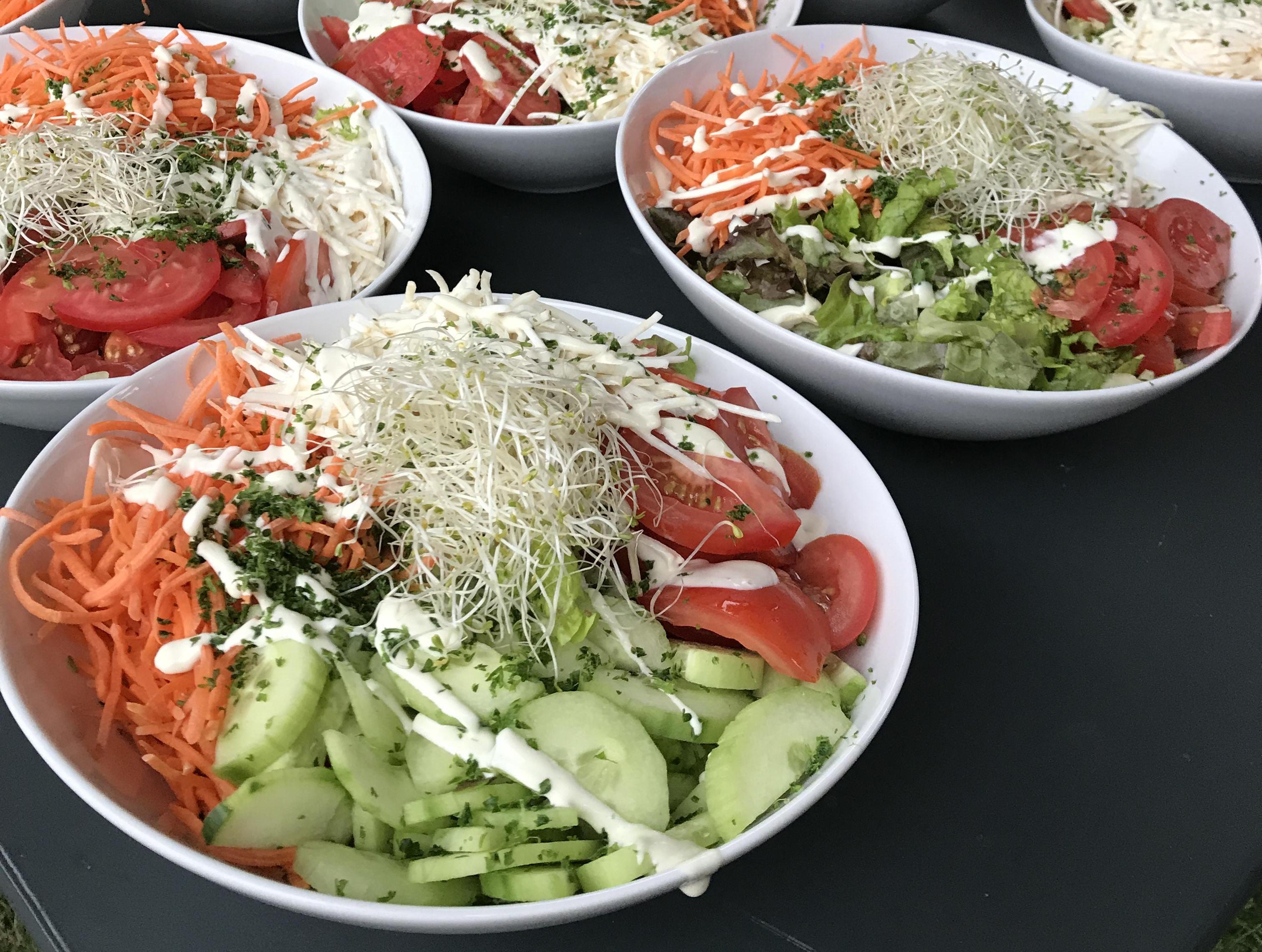 Wortelen, tomaten, komkommer, salade, aardappelen in de pel of frietjes, cocktailsaus en mayonaise zijn steeds in de prijs inbegrepen. Borden en bestek in een pochet ook inbegrepen.